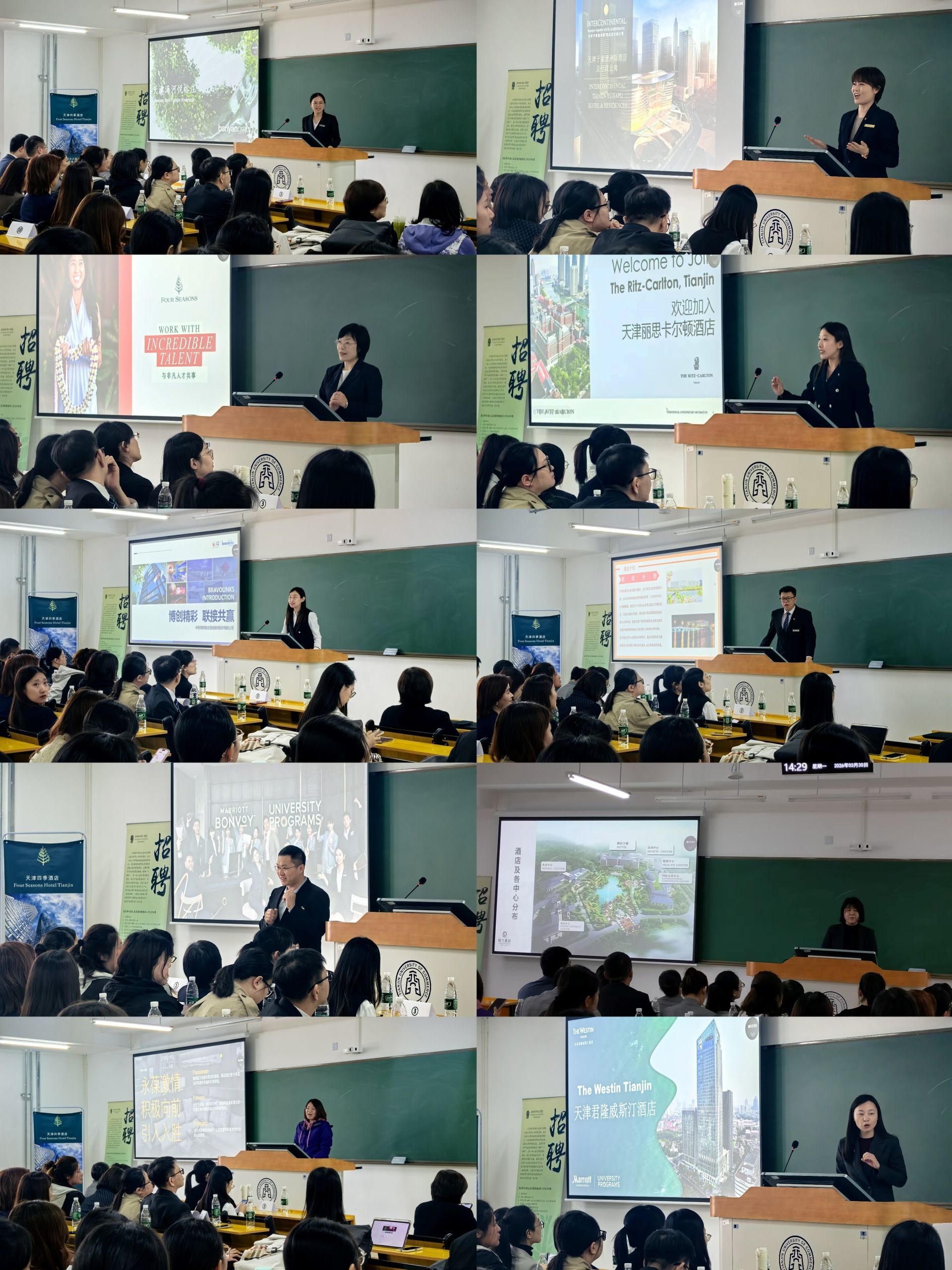 双选会汇聚天津丽思卡尔顿酒店、天津四季酒店、万丽天津宾馆、于家堡洲际酒店、天津海河悦榕庄酒店、滨海圣光皇冠假日酒店、陆家嘴万怡酒店、蓟州恒大酒店、君隆威斯汀酒店、中青博联等10家区域头部酒店及文旅企业,提供覆盖高端服务、市场营销、数字化运营等多领域优质实习岗位,搭建起校企精准对接、人才高效匹配的优质平台。