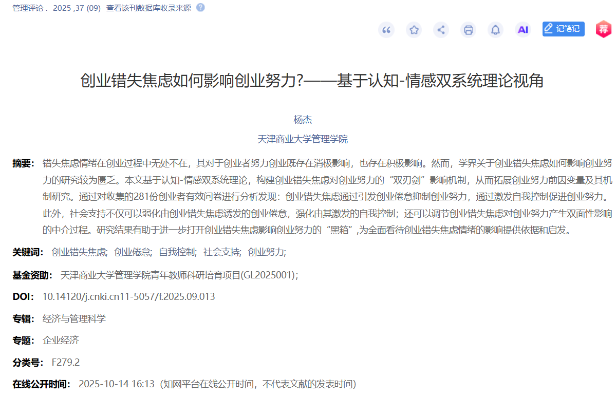 杨杰老师以独作身份在《管理评论》(CSSCI;国家自然基金委认定的A类刊物,FMS中文T1)发表题目为“创业错失焦虑如何影响创业努力?——基于认知-情感双系统理论视角”的学术论文。
